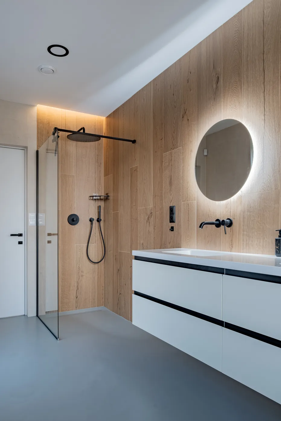 Navržená novostavba rodinné vily představuje harmonické spojení současné architektury, komfortu a velkorysého prostoru. Dům je koncipován s jasným oddělením denního a nočního provozu – první podlaží je věnováno společným obytným funkcím a soukromému wellness. Společenská část s krbem se plynule rozšiřuje do venkovního prostoru a velkoryse se otevírá do zahrady, čímž vzniká přirozené propojení interiéru s exteriérem.