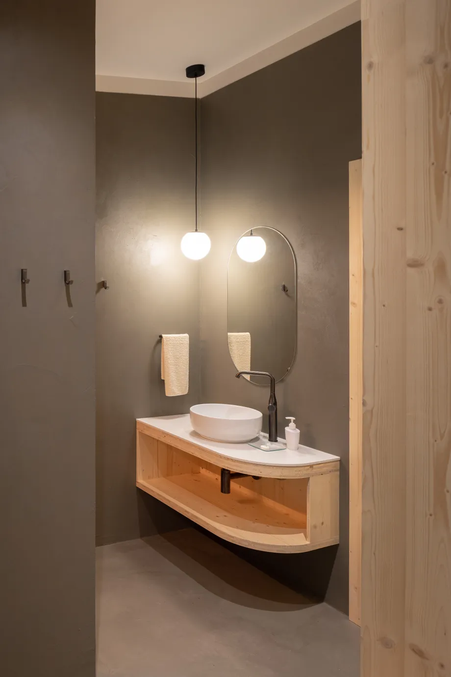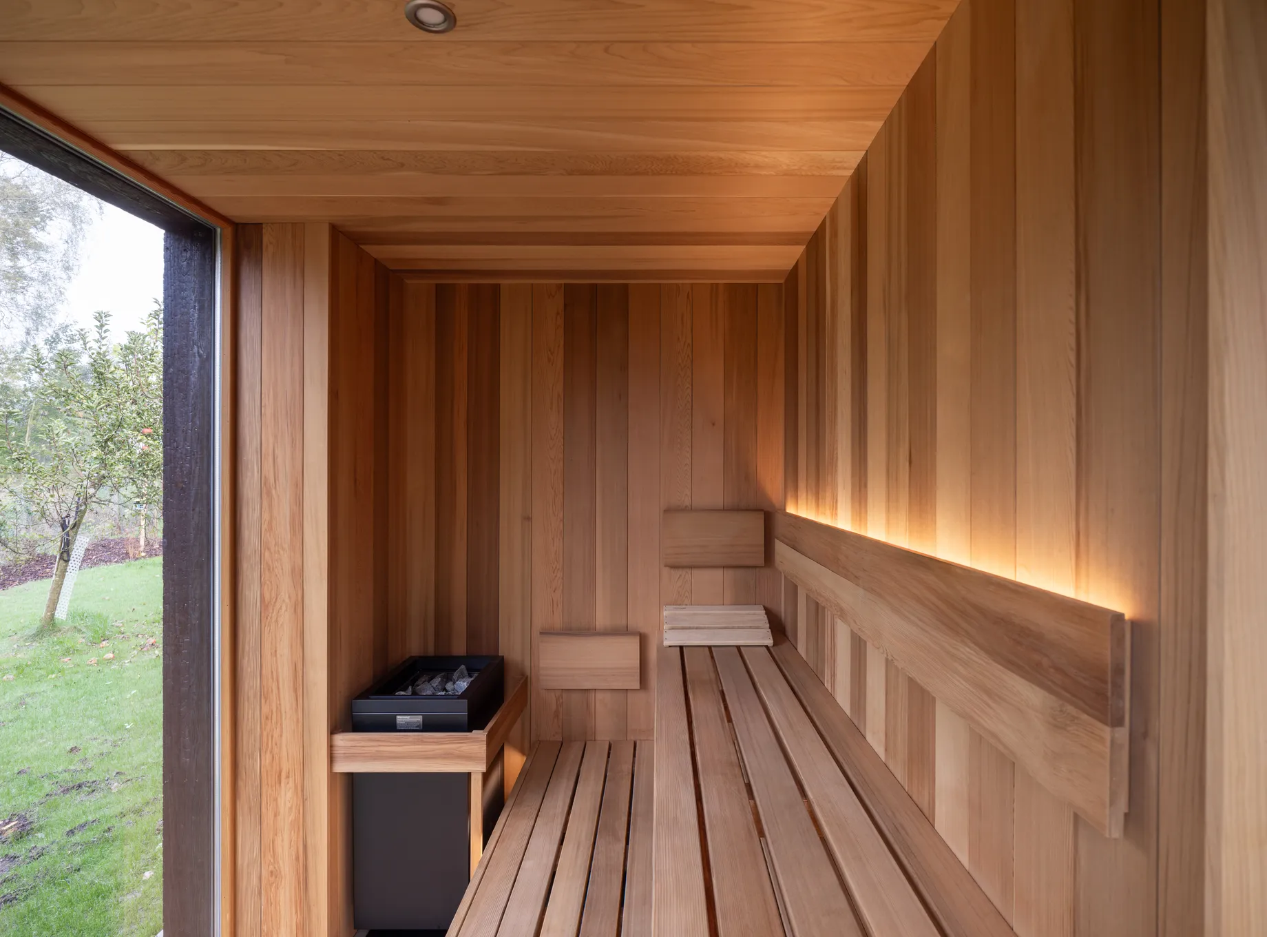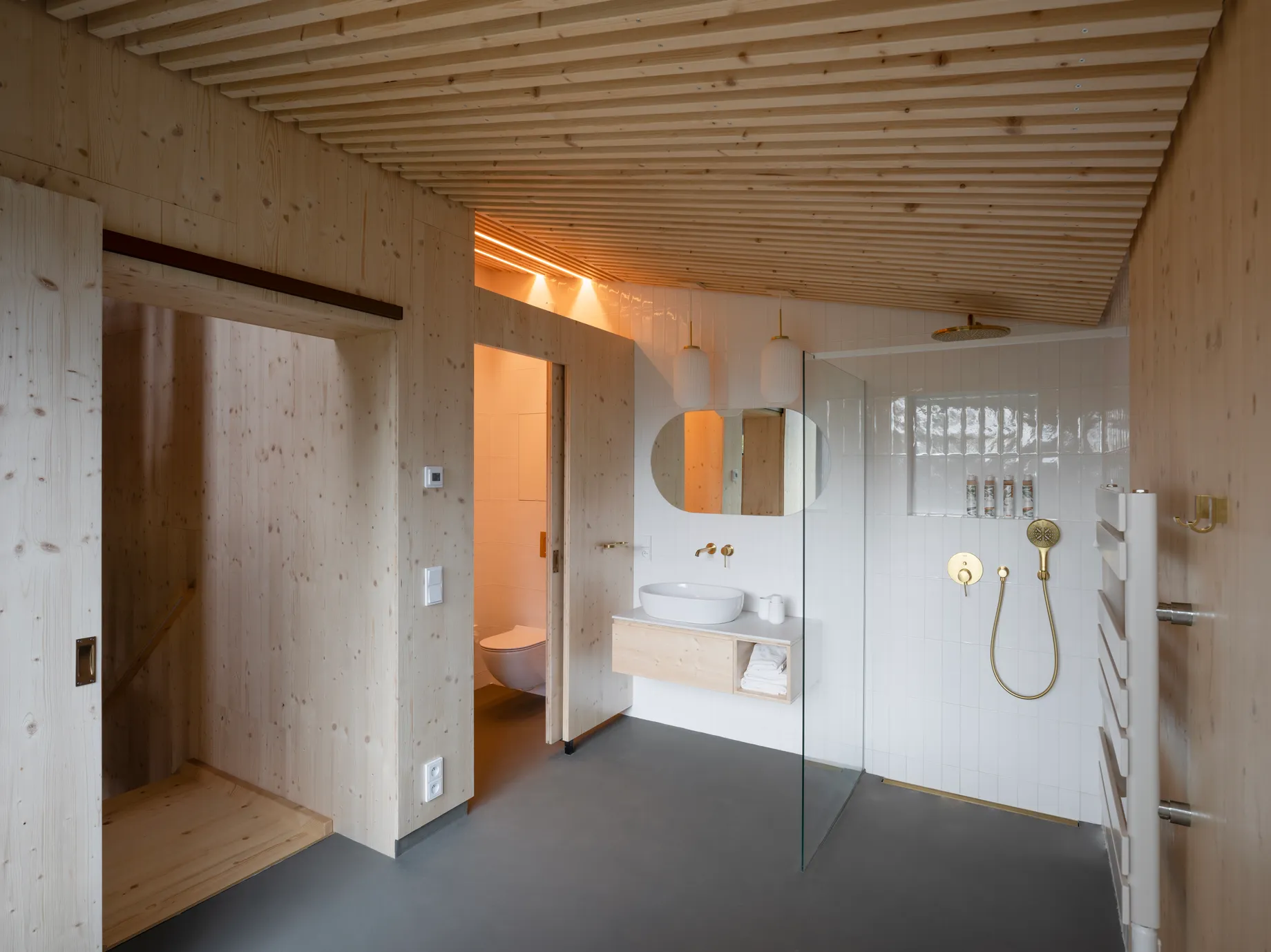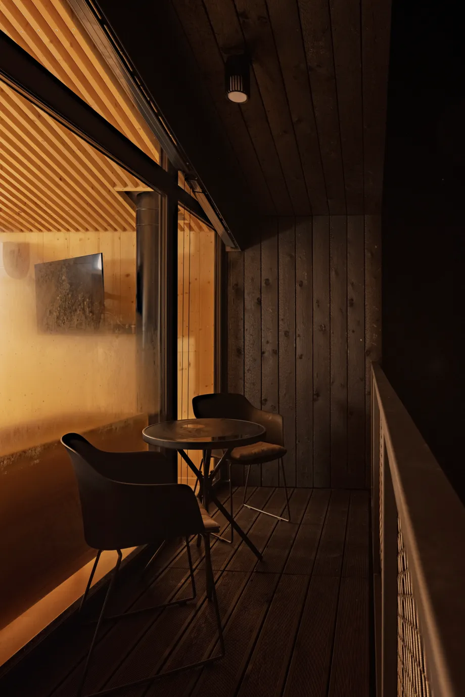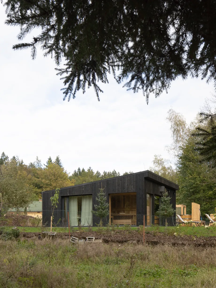 Vnitřní a vnější prostory jsou navrženy tak, aby vytvářely jednotný prostor, v němž se stírá rozdíl mezi exteriérem a interiérem. Fasáda z opalovaného dřeva, se kontextuálně zapojuje do krajinného rázu a zajišťuje dlouhodobou odolnost. Krajinné řešení parteru prohlubuje propojení s vegetací, čímž vytváří autentický zážitek v souladu s okolním prostředím.