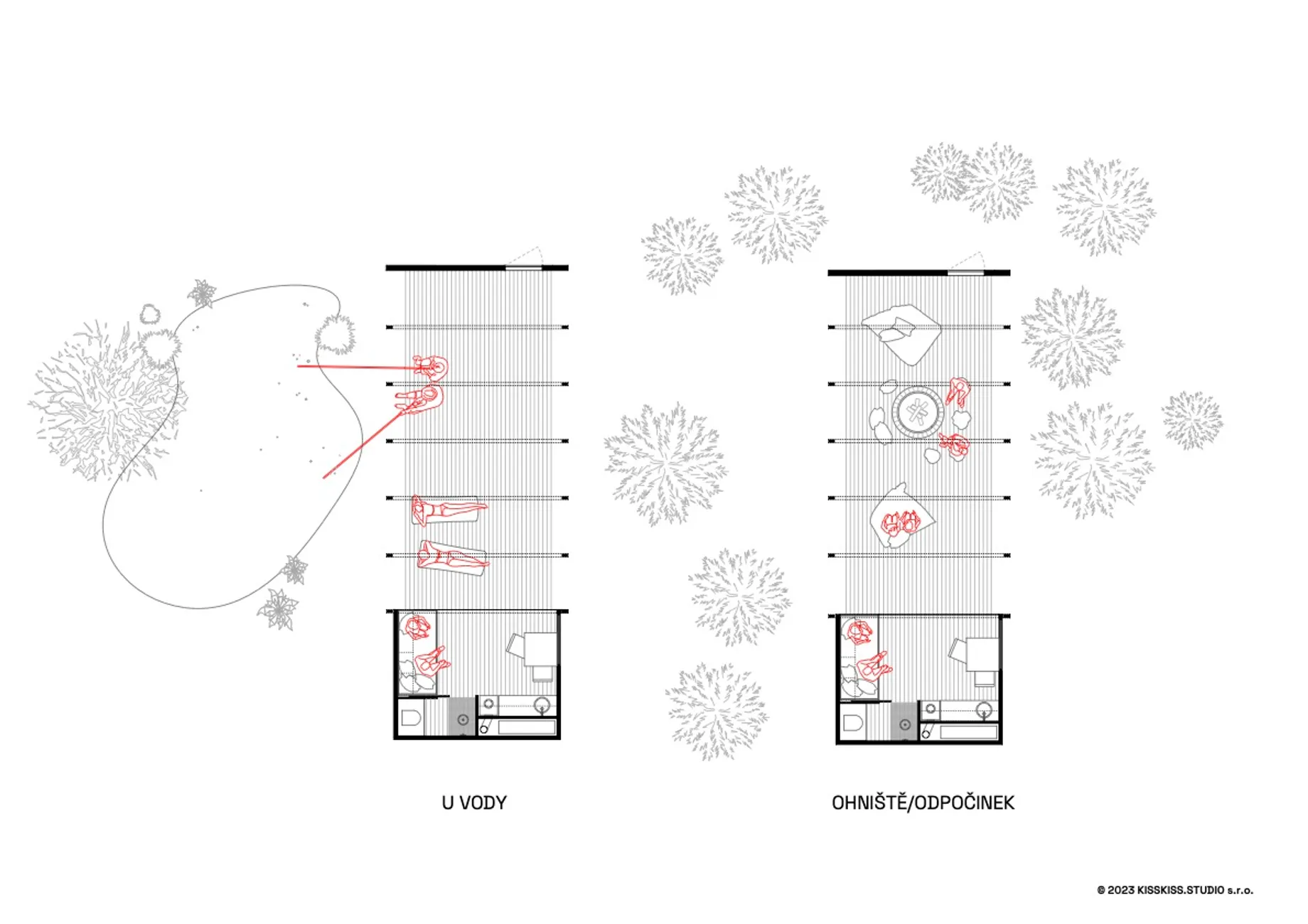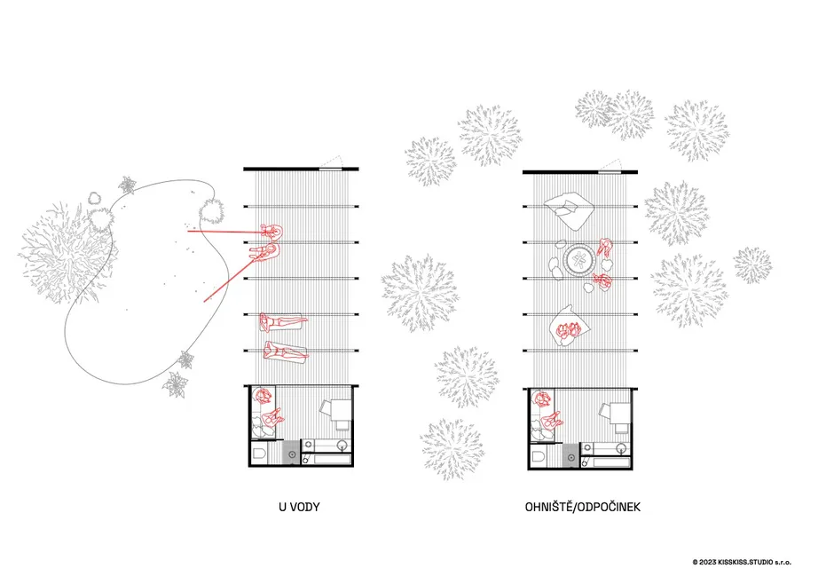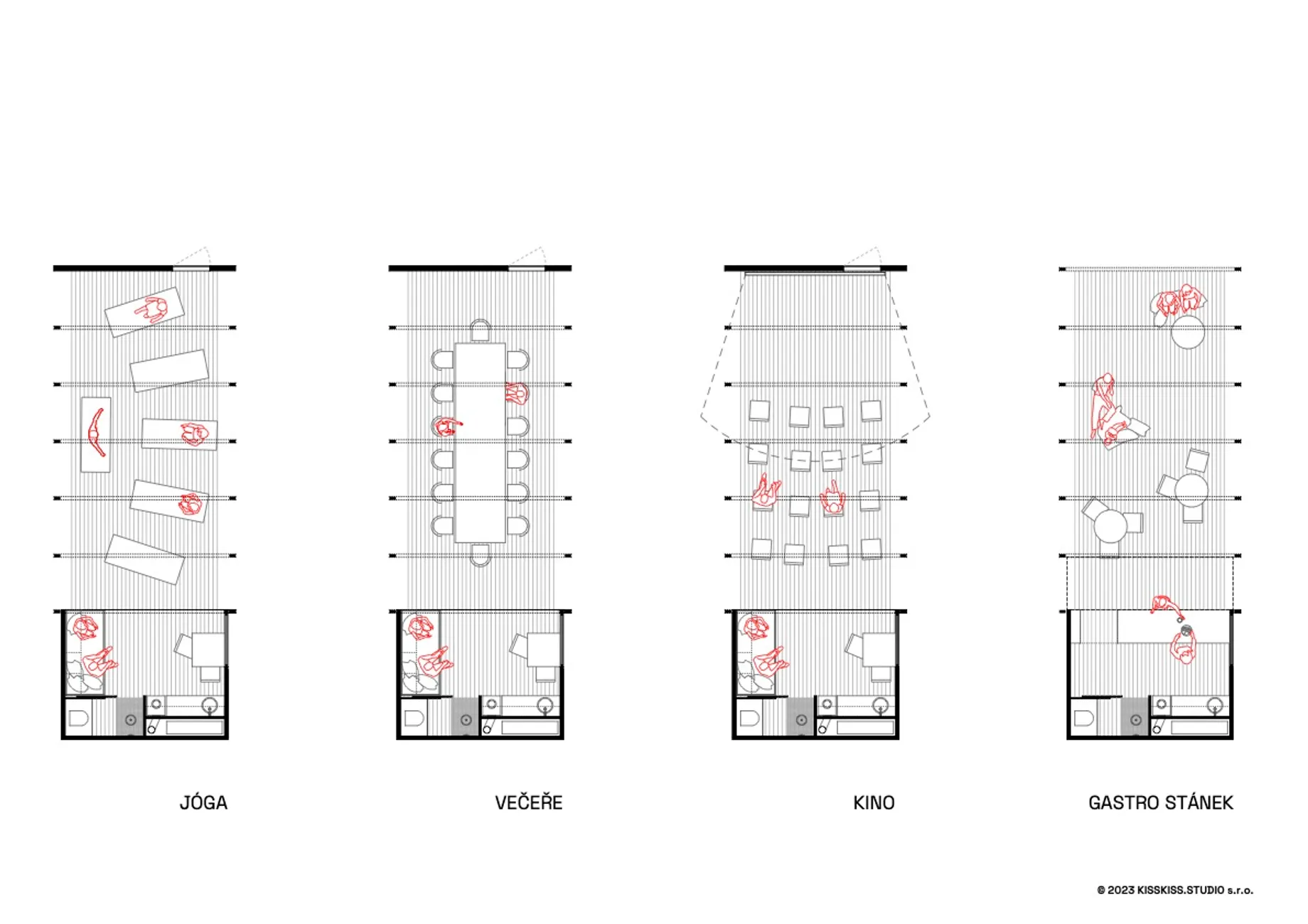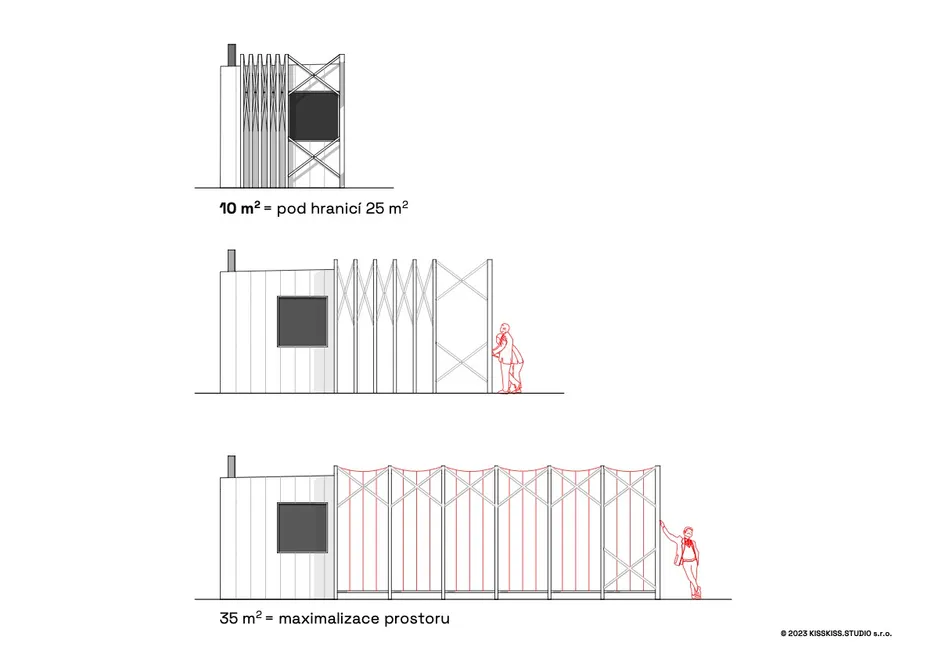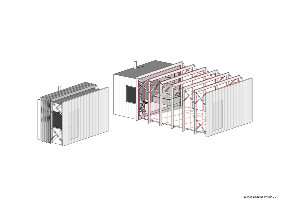 Tiny Tent jsme navrhli jako univerzální, rozšiřitelný prostor pro multifunkční využití. Základ tvoří malá dřevostavba, kterou lze díky systému rámů a membrán přizpůsobit aktuálním potřebám. Nabízí zázemí s plnohodnotnou kuchyní, sprchou, toaletou a teplou vodou. Je kompaktní, ale zároveň umožňuje velkorysé rozšíření, pokud to situace vyžaduje.