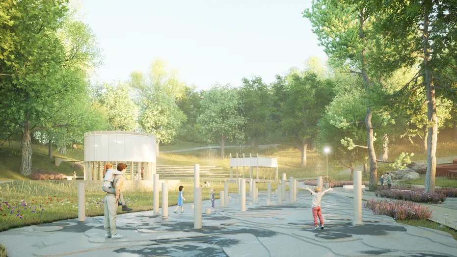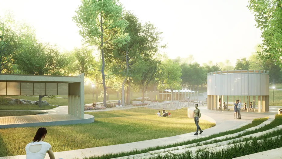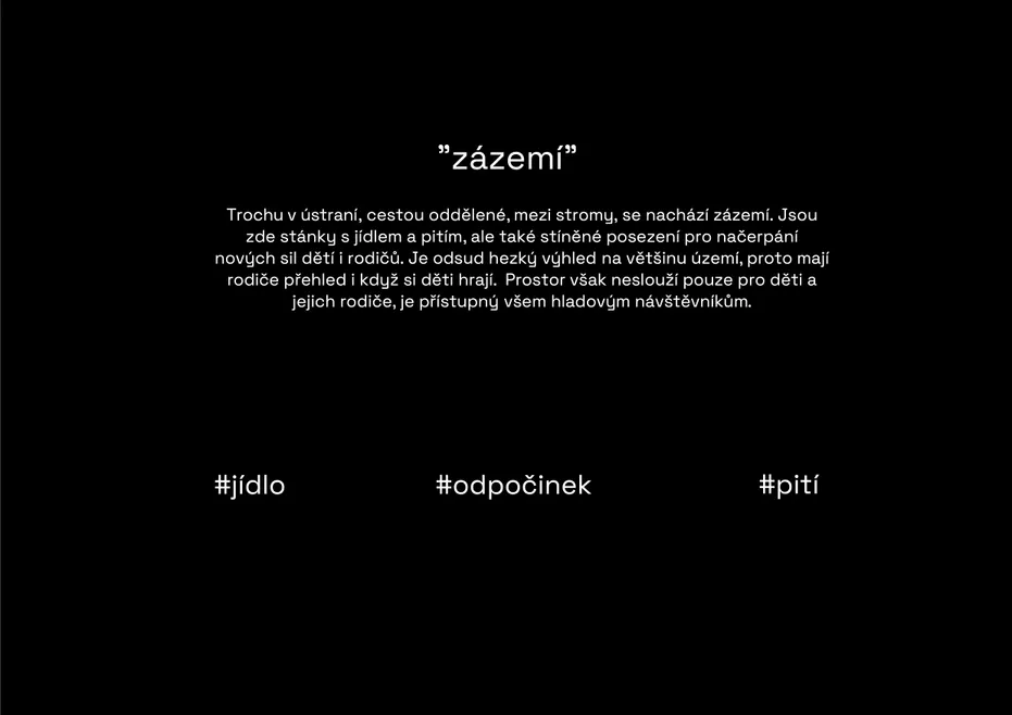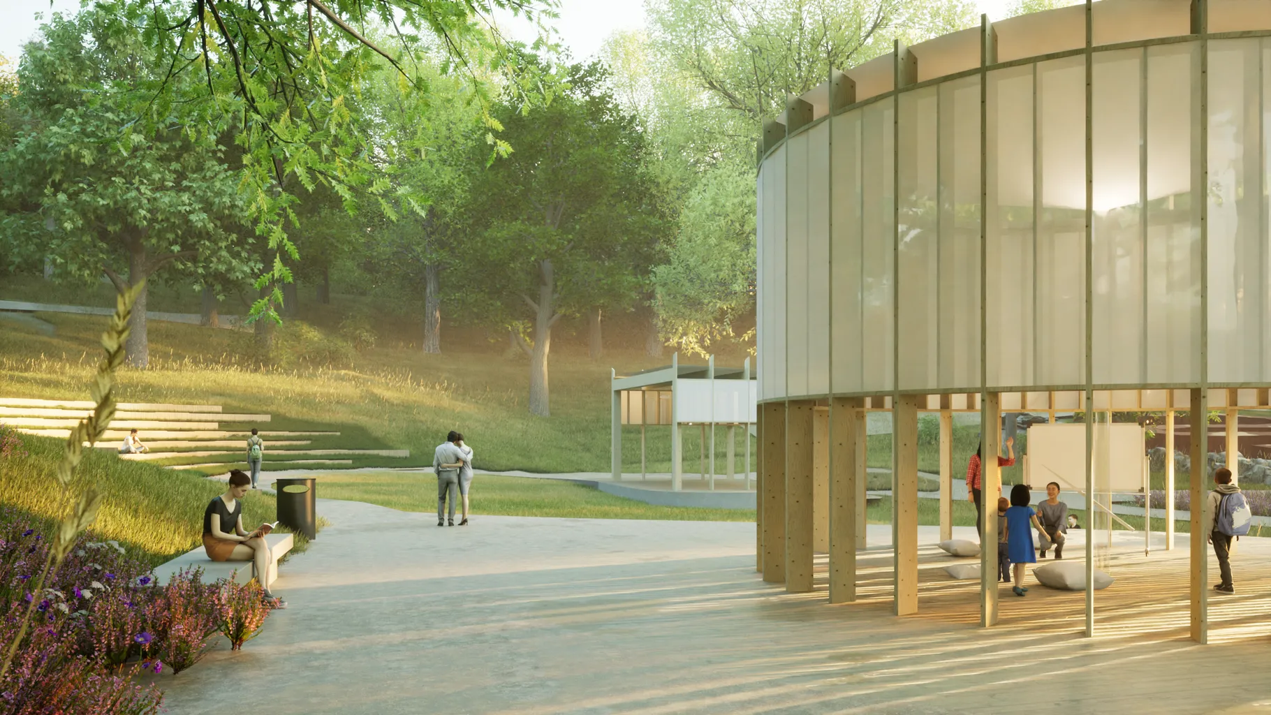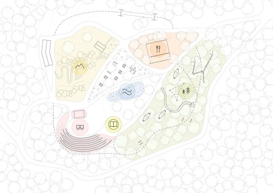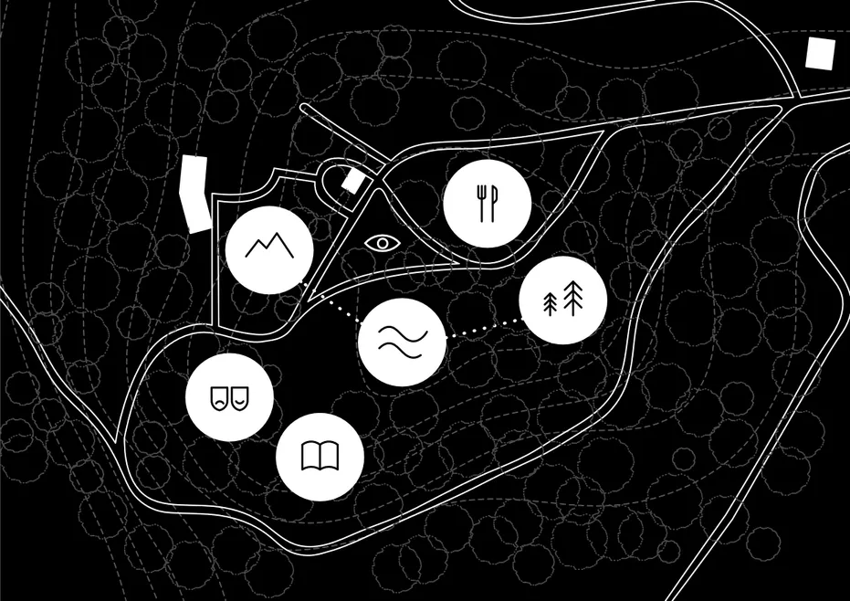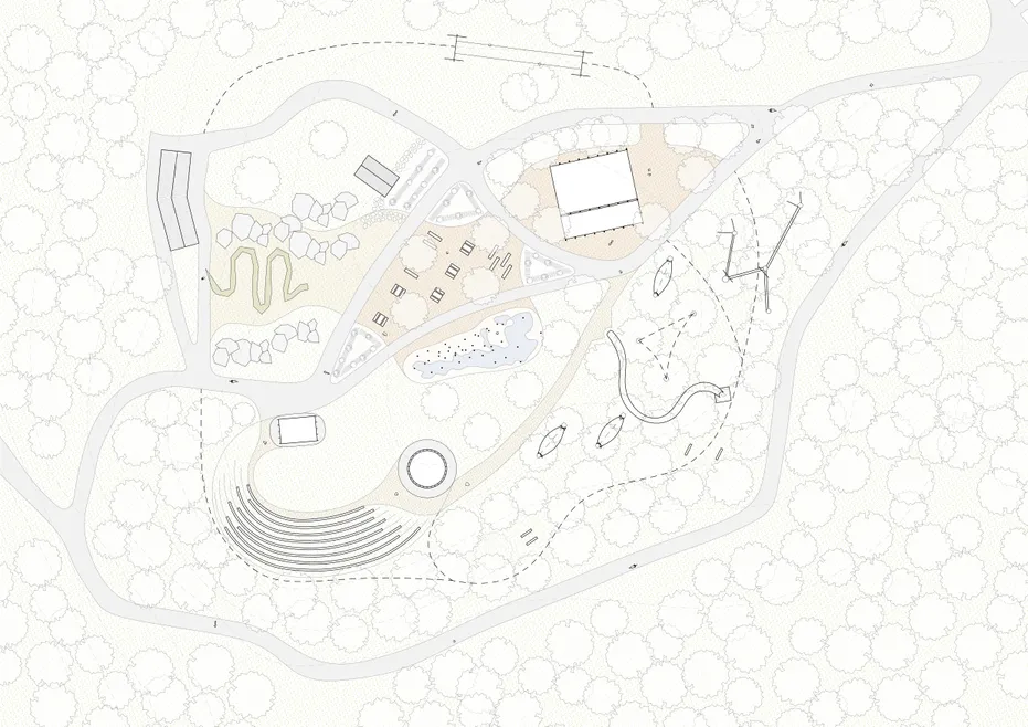 Soubor drobných staveb nabídne návštěvníkům komplexní zážitek, který zahrnuje amfiteátr pro společenské a kulturní akce, nové bistro pro gastronomii a vzdělávací pavilon. Kromě toho prostor zahrnuje dětská hřiště, umělecké instalace a relaxační zóny. Krajinné řešení celé oblasti podporuje a posiluje tento koncept.