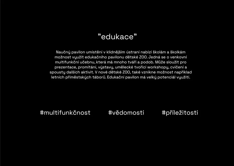 V jednom z největších zooparků ve střední Evropě jsme navrhli komplex pavilonů a veřejných prostranství, který tvoří funkční celek. Projekt pokrývá plochu 10 000 m² a má ambici stát se regionálním centrem setkávání, vzdělávání, kultury a odpočinku v přírodě.